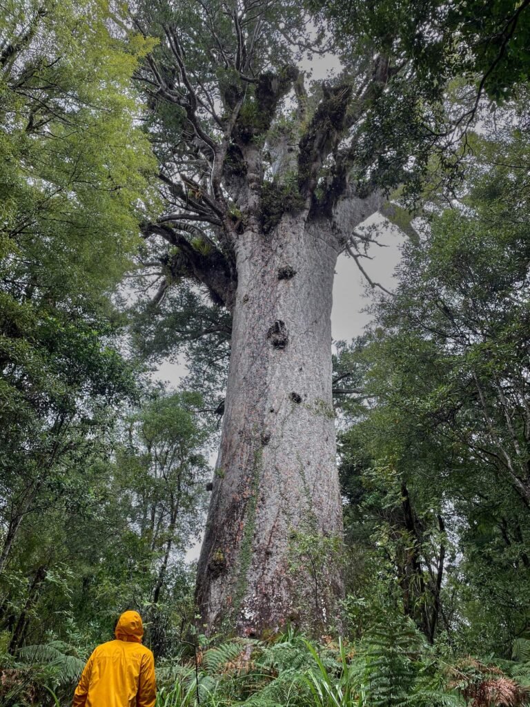 Vom Piha Beach ging es für uns ein ganzes Stück weiter in Richtung Northland – dort treffen uralte Regenwälder und Kauri-Giganten auf spirituelle Māori-Kultur und endlose Strände mit türkisblauen Buchten. Unser erster Stopp war ein ganz besonderer Ort – der uralte Waipoua Kauri Forest mit den teils über 2000 Jahre alten Kauri-Giganten. Wir waren im Oktober dort und sagen wir es mal so: Es hat aus gigantischen Eimern geschüttet. Wir haben es uns trotzdem nicht nehmen lassen – ausgerüstet mit nicht wasserdichten Regenjacken, was wir nach einer halben Stunde feststellen mussten – die größten Kauri-Bäume der Welt mit eigenen Augen zu sehen. Leider haben nur sehr wenige, wirklich alte und sehr große Bäume überlebt, was die Baumart umso wertvoller macht. Grund sind vor allem die Kauri-Dieback-Krankheit und die jahrzehntelange intensive Abholzung. Gleich am Eingang der Wanderung findet ihr eine „Reinigungsstation für eure Wanderschuhe„- bitte nutzt sie auch, um die empfindlichen Wälder vor eingeschleppten Krankheiten zu schützen.