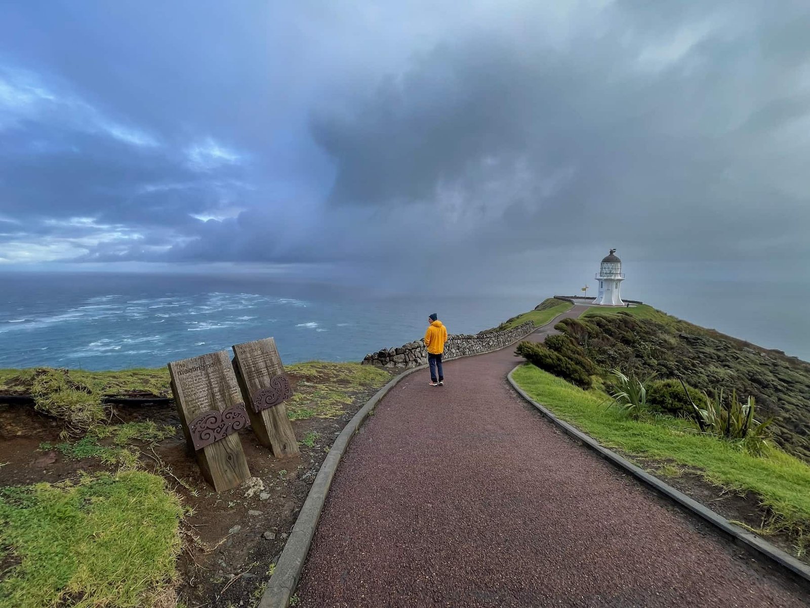 Am Küstenvorsprung verlässt die Seele dann am „Spirits Tree“ unsere Welt. Der 800 Jahre alte Baum ist dünn, eher unscheinbar und wächst einsam an einem Felsen – wir mussten ehrlich gesagt zweimal hinschauen, um ihn zu erkennen. Es gibt eine Aussichtsplattform „Te Aroha“, von der aus ihr den Bau aus der Ferne anschauen könnt – er liegt auf einem Felsvorsprung unterhalb des Leuchtturms, das heißt es gibt keinen direkten Weg zum Baum. Genau an diesem Punkt treffen zwei Meere aufeinander, die Tasmansee und der Pazifische Ozean und verursachen extreme Strudel – dieser besondere Platz wird auch Te Ara Wairua genannt „Straße der Seelen„. Das Naturschauspiel hat uns ganz schön in seinen Bann gezogen – wir standen gefühlt eine Stunde dort und haben uns die Info Tafel durchgelesen.