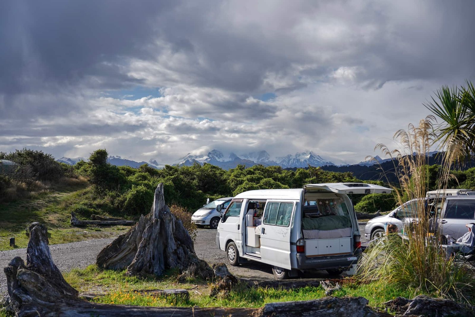 Die beiden kleinen Orte Franz Josef und Fox Glacier sind absolute Touri-Hotspots und dementsprechend überlaufen. Uns waren die Campingplätze persönlich zu voll, deshalb sind wir etwas außerhalb auf dem Gillespies Beach Campground geblieben – er liegt direkt am Meer und hat eine unfassbar schöne Aussicht auf die Südalpen. Außerdem liegt er in der Nähe einer alten Goldgräbersiedlung mit vielen historischen Bergbau-Relikte aus der Goldgräberzeit – in der Nähe gibt es sogar einen verlassenen alten Goldgräber-Friedhof. Wir haben den Tag mit Freunden und einem kleinen Feuer am Strand ausklingen lassen – informiert euch unbedingt vorher, ob Feuer zu der Zeit wo ihr dort seit erlaubt sind. Einziger Nachteil: Es wimmelt von Sandflies, packt euch also gut ein!