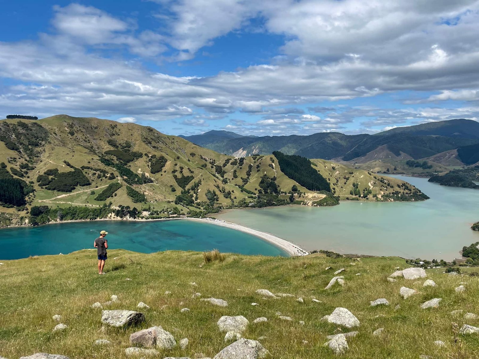 Auf dem Weg nach Nelson kommt ihr an der zweifarbigen Cable Bay vorbei, die durch eine Sandbank in zwei komplett unterschiedliche Buchten mit verschiedenen Blautönen geteilt wird. Es gibt vor Ort leider nur sehr wenige Parkplätze – falls es keine freien Plätze gibt wartet einfach bis jemand raus fährt. Packt auf dem Weg zum Strand unbedingt eure Campingstühle und Kühlboxen ein, denn hier kommt ihr definitiv in „Urlaubsstimmung“. Nach unserer Blaupause am Strand sind wir zum Aussichtspunkt auf den Berg (siehe Bild). Der Weg ist zwar teilweise echt steil, dafür werdet ihr mit einer Aussicht belohnt, die ihr so schnell nicht wieder sehen werdet – Karibik-Feeling vom feinsten.