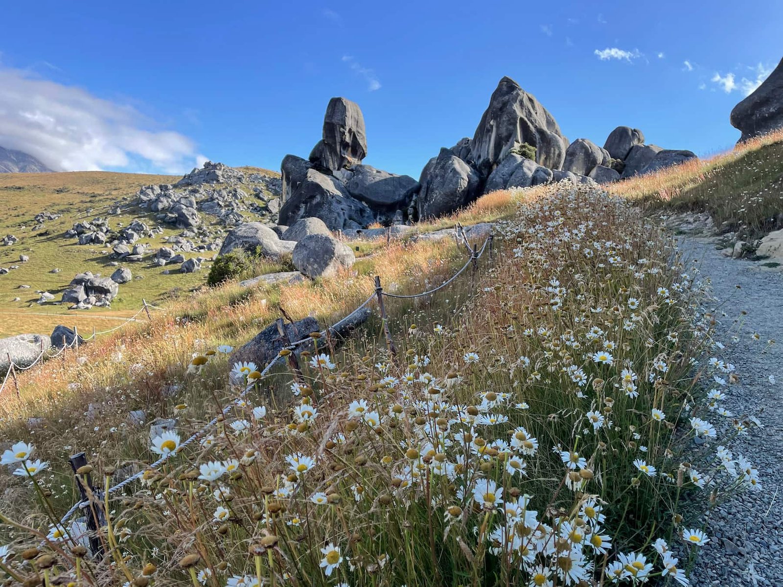 Unser erster Stopp war am berühmten Castle Hill – vor allem bekannt für seine gigantischen Kalksteinblöcke, die glatt so aussehen als hätte ein Troll sie dorthin geworfen! Ein kurzer Kieselpfad führt euch vom Parkplatz direkt zu den teilweise meterhohen Felsen – es geht leicht Bergauf, wofür ihr etwa 15 min. einrechnen solltet. Auf dem Weg kommt ihr an vielen bunten Wildblumen und einigen Menschen mit großen schwarzen Matten auf ihren Rücken vorbei – die Gegend ist ein absolutes Kletterparadies & ein „Must-do“, wenn es um’s Bouldern geht. Oben Angekommen hat uns die Aussicht auf die Berge und die steinig-schroffe Graslandschaft wortwörtlich umgehauen -besonders die weißen Berg-Gänseblümchen zwischen den Felsen und dem Pfad haben dem Stein-Hügel eine ganz besondere Note gegeben (blühen meist im Frühling/Sommer).