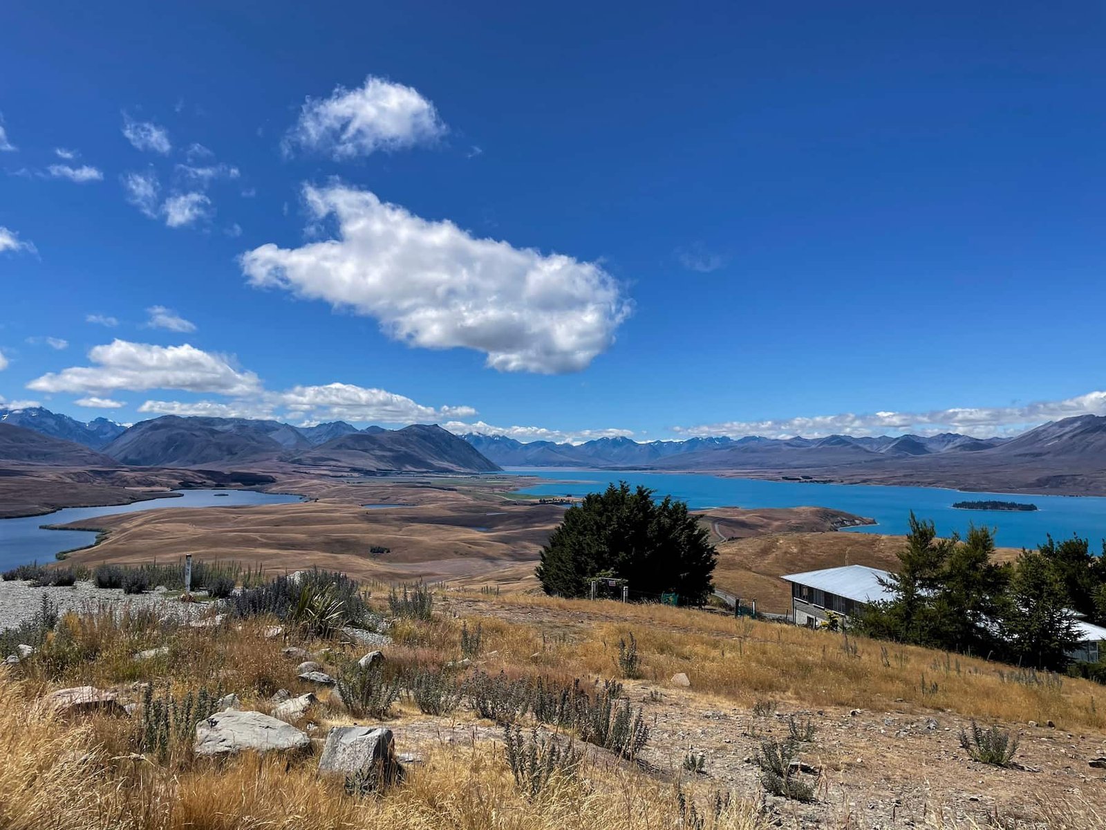 Direkt neben dem Mount John Observatorium liegt das  Astro Café – ein Aussichtspunkt mit 360°-Blick auf den türkisblauen Lake Tekapo und die umliegenden Südalpen, der euch die Socken ausziehen wird. Alleine die kurvige Passstraße nach oben bzw. nach unten wird euch die Kinnlade offen stehen lassen – haltet also eure Kamera griffbereit! Bis etwa 14 Uhr bekommt ihr im Café superleckeren Kuchen – teilweise auch vegan und glutenfrei – und warme Getränke. Bevor ihr aber die Straße hochfahren könnt, müsst ihr an der Schranke am Eingang eine Gebühr von 14 NZD pro Auto bezahlen – ab 17 Uhr wird die Straße dann zum Schutz der Natur, aber auch zur Kontrolle vor zu vielen nächtlichen Sternenbeobachtern gesperrt. Theoretisch könnt ihr sie aber nach 17 Uhr trotzdem hochlaufen.