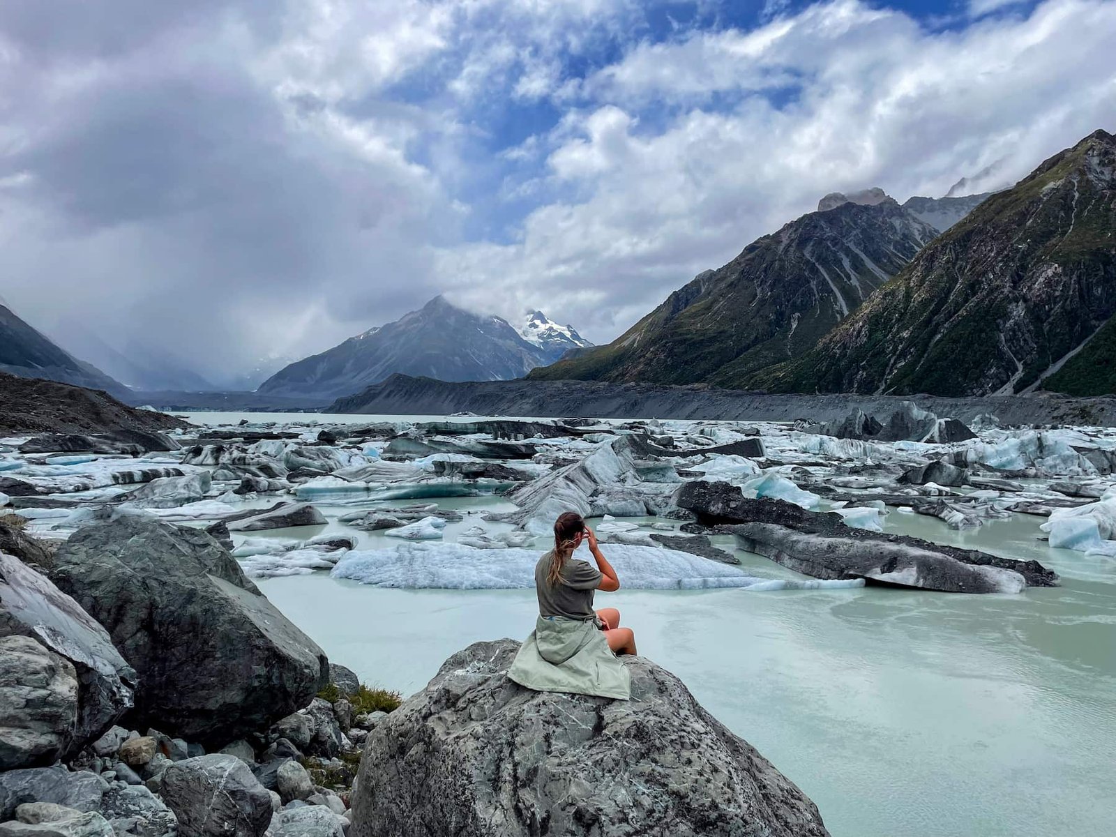 Der Campingplatz ist Ausgangspunkt für einige der schönsten Wanderungen der Welt – darunter die berühmte Gletscherwanderung zur Mueller Hut und der Hooker Valley Track, der euch um gleichnamigen Hooker Lake führt. Wir haben beide Tracks gemacht und waren absolut überwältig von der Aussicht, die bei beiden Wanderungen doch sehr unterschiedlich war. Der Hooker Valley Track ist ein wirklich super einfacher Weg und endet am Hooker Lake, in dem selbst im Sommer immer mal wieder Eisberge herumtreiben. Der Weg ist ungefähr 10 km lang (hin und zurück), wofür ihr mindestens 3 Stunden (hin und zurück) einrechnen solltet. Außerdem erwarten euch auf dem Weg drei Stahlhängebrücken, die euch über den reißenden und schon fast milchig weißen Gletscherfluss führen und ein Blick auf das idyllische Hooker Tal, dass von hohen Bergen und Gletschern der Südalpen umgeben wird.