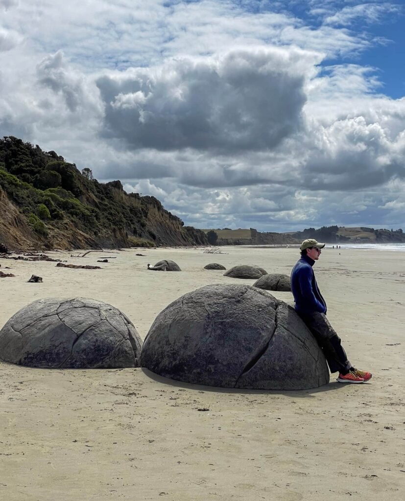 Den kompletten nächsten Tag haben wir am Strand verbracht und sind vom Campingplatz aus etwa 20 Minuten zum Wharariki Beach gelaufen. Nimmt auf jeden Fall eine kleine Kühltasche mit Snacks und kalten Getränken mit – das macht den Tag definitiv entspannter! Auf dem Weg zum Strand kommt ihr dann an vielen Kühen, windschiefen Bäumen und idyllischen Hobbit-Hügeln vorbei – ein interessanter Mix aus allem, was Neuseeland so zu bieten hat.